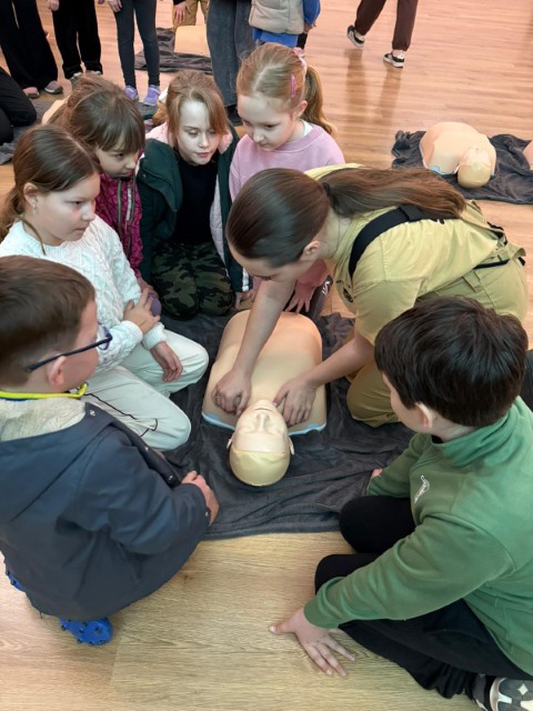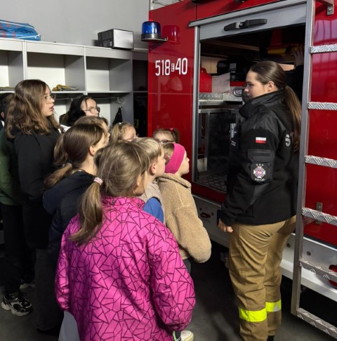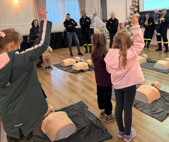Dzieci w towarzystwie osoby dorosłej oglądają bojowy wóz strażacki  Dzieci uczestniczą w szkoleniu z zakresu pierwszej pomocy przedmedycznej. Nauka udzielania pomocy na fantomach  Szkolenie z zakresu pierwszej pomocy przedmedycznej. Szkolenie na fantomach