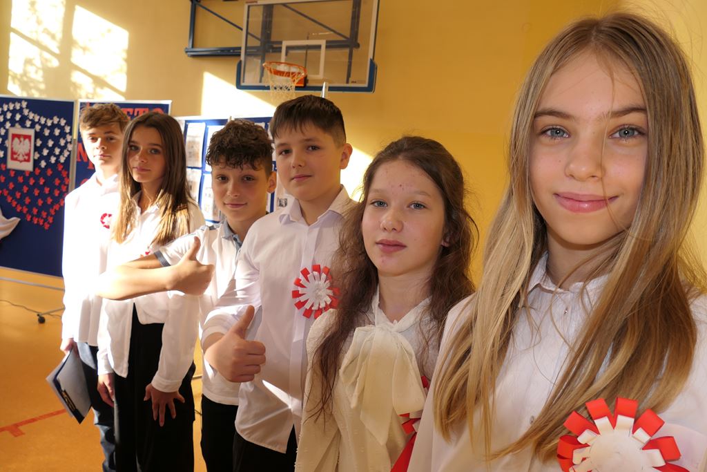 Uczniowie w galowych strojach podczas akademii z okazji Narodowego Święta Niepodległości. Widoczne są biało - czerwone flagi Uczniowie w galowych strojach podczas akademii z okazji Narodowego Święta Niepodległości Uczniowie w galowych strojach podczas akademii z okazji Narodowego Święta Niepodległości