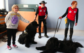 - Jaga i Mat to Nowofunlandy. Rasa ta od 10 lat jest używana głównie w prewencji, jest wykorzystywana głównie jako psy zabezpieczające kąpieliska, ale właśnie w ramach prewencji. Na co chciałabym zwrócić uwagę: nowofunlandy są łagodne. Wiele z dzieci nie mając kontaktu z tak dużym zwierzęciem boi się go. Po bliższym poznaniu przekonuje się do niego. To jest dogoterapia. Spotkanie Jagi i Mata z uczniami szkoły w Dziepółci jest tego przykładem – zauważa Joanna Malecka, właścicielka Jagi i Mata.