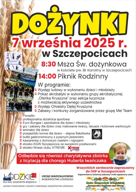 Wzorem lat ubiegłych serdecznie zapraszamy wszystkich mieszkańców oraz gości na Dożynki w Szczepicicach, które odbędą się w niedzielę, 7 września 2025 r. Tegoroczne wydarzenie będzie miało szczególny wymiar – towarzyszyć mu będzie zbiórka na rzecz chorego Huberta Iwańczaka.